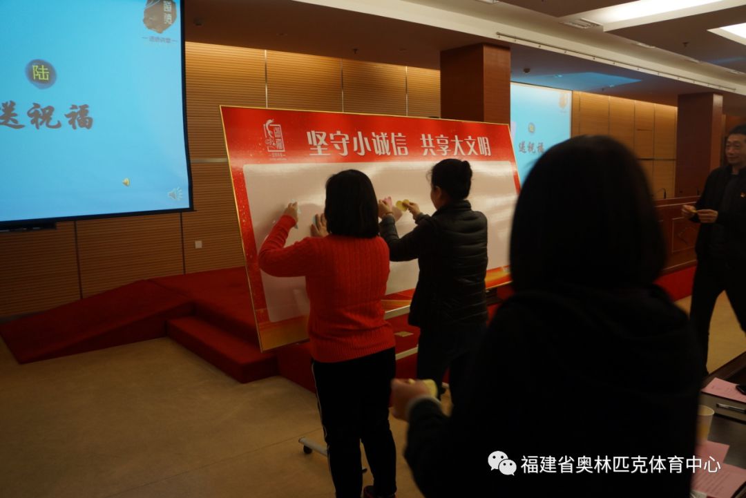 12月20日,省奧體中心舉辦了主題為“堅(jiān)守小誠(chéng)信,共享大文明”的道德講堂宣講活動(dòng)。本期道德講堂共分“唱一首歌曲、誦一段經(jīng)典、講一個(gè)故事、作一番省身、分享一段體會(huì)、許一份承諾和送一份祝?!逼邆€(gè)環(huán)節(jié)。中心全體干部職工參加了本次活動(dòng)。