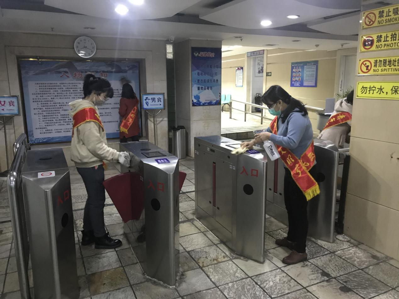 對(duì)售票大廳、窗口、閘機(jī)、男女更衣室進(jìn)行消毒