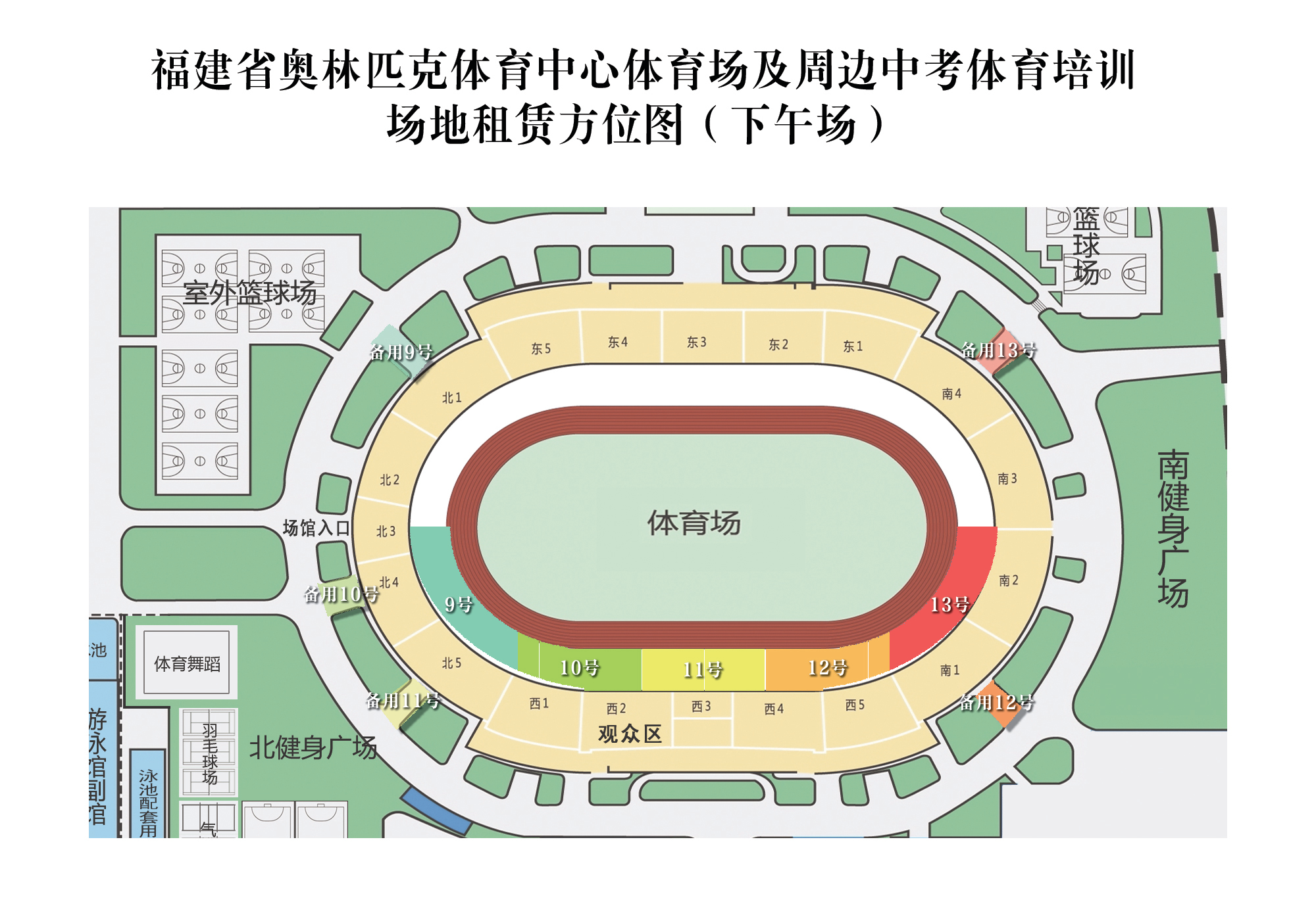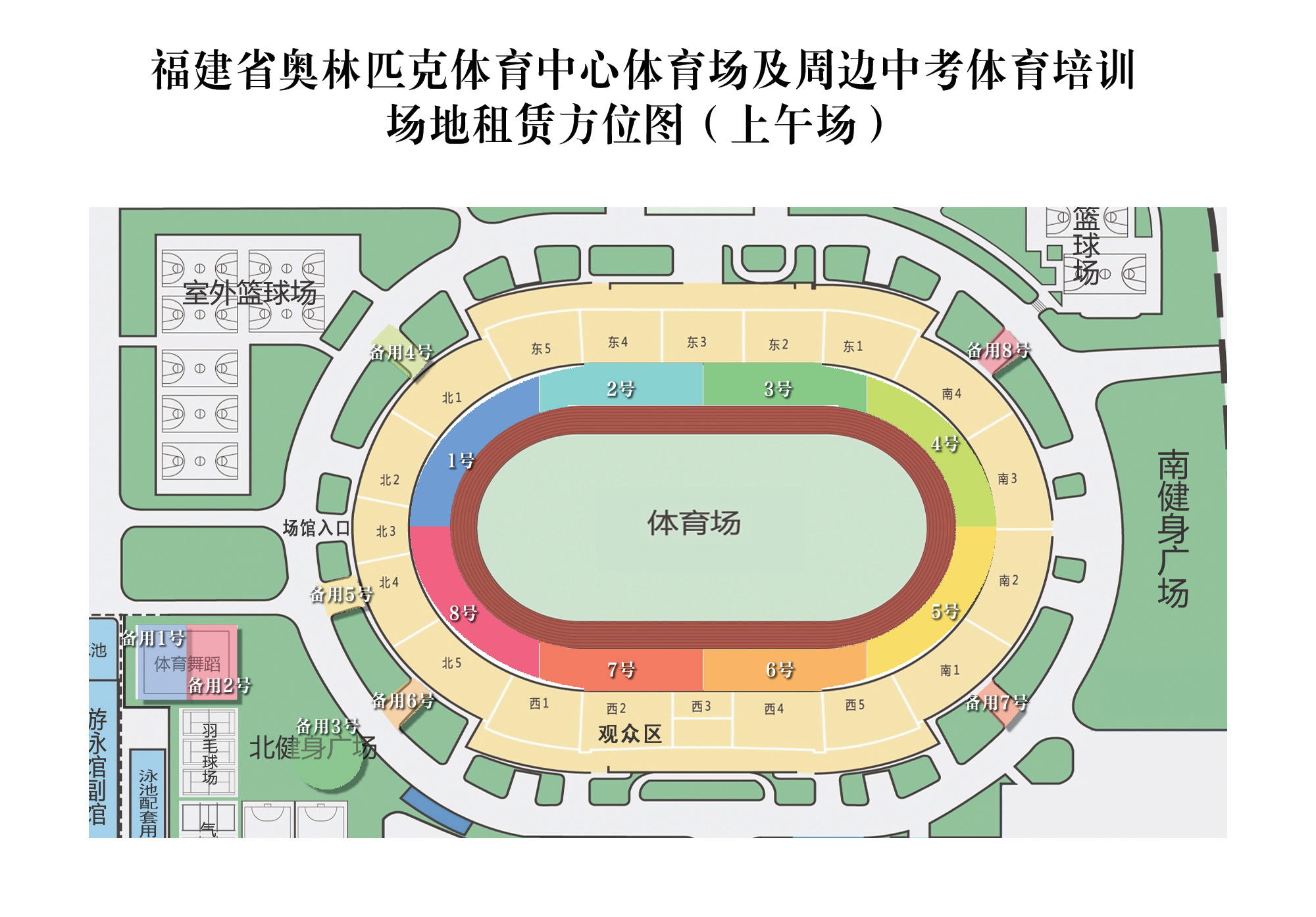 7.特別說明:福建省奧林匹克體育中心體育場內(nèi)中考體育培訓(xùn)1-8號區(qū)域(上午8:00-11:00),一個承租人僅允許承租其中一個區(qū)域;9-13號區(qū)域(下午14:00-17:00),一個承租人僅允許承租其中一個區(qū)域。