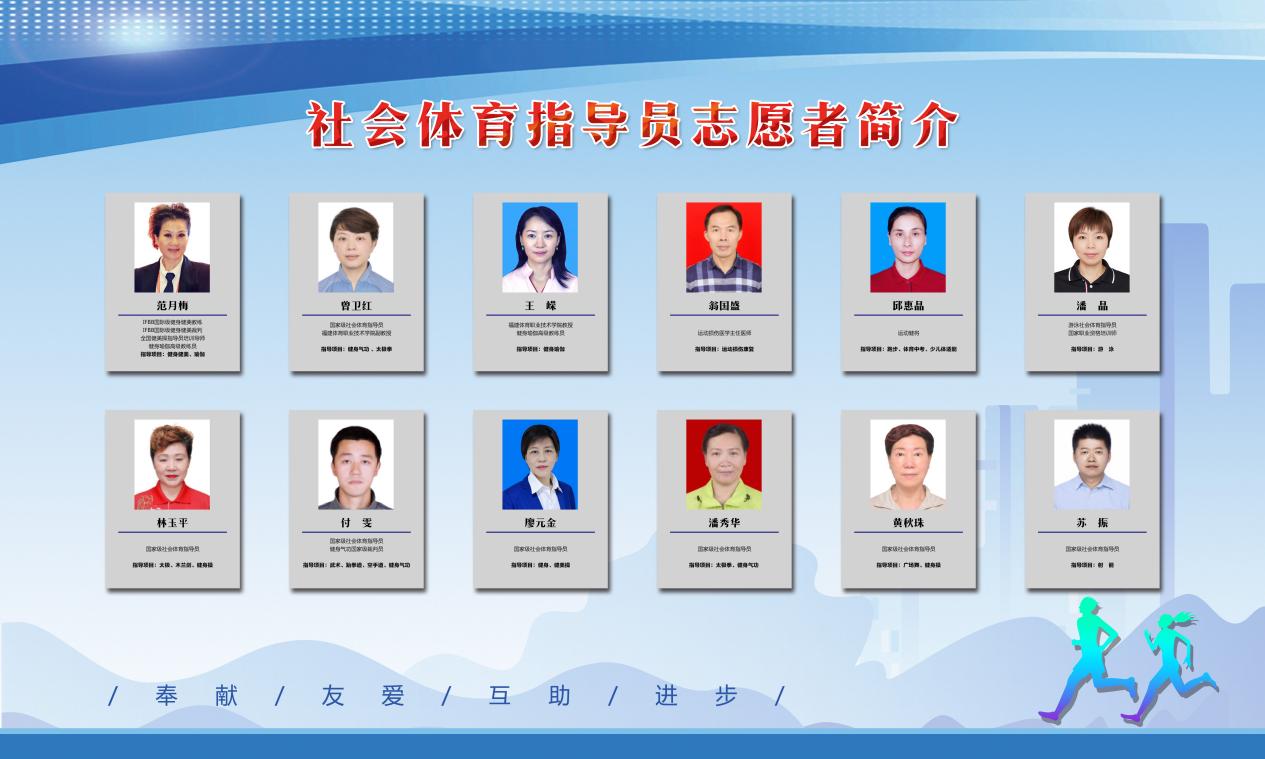經(jīng)過前期的精心籌備和志愿者招募,截至掛牌之日,已有25名國(guó)家級(jí)健身教練、國(guó)家級(jí)社會(huì)體育指導(dǎo)員、運(yùn)動(dòng)健將、運(yùn)動(dòng)康復(fù)師、運(yùn)動(dòng)處方師、體育教師等體育專業(yè)人士報(bào)名加入了志愿服務(wù)團(tuán)隊(duì)。指導(dǎo)項(xiàng)目豐富多樣,涵蓋了健身氣功、太極拳、木蘭劍、健身操、瑜伽、跆拳道、田徑、游泳、少兒體適能、體育中考、射箭、運(yùn)動(dòng)損傷康復(fù)等項(xiàng)目。