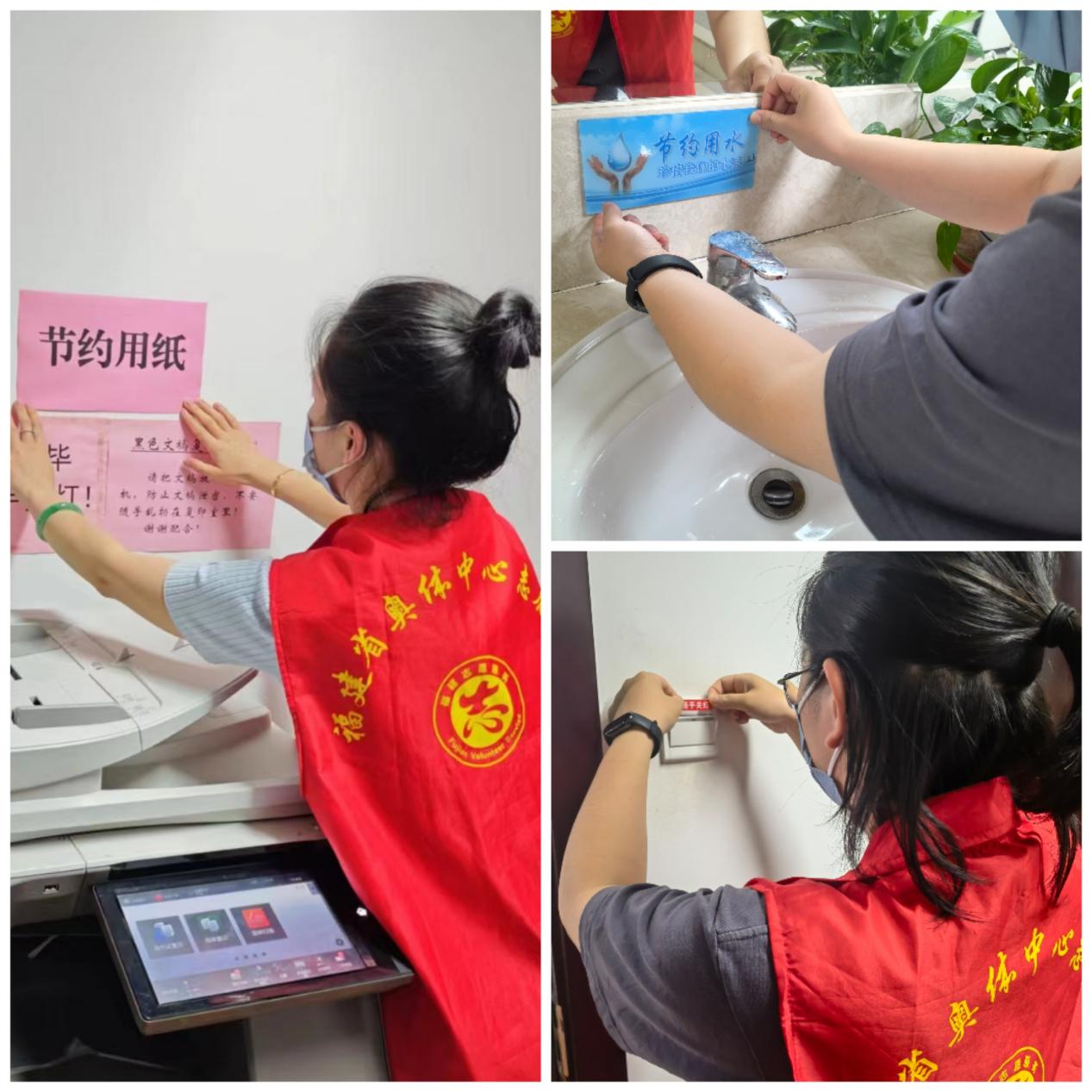 為進(jìn)一步傳播綠色低碳發(fā)展理念,充分發(fā)揮黨員志愿者在“綠色低碳 節(jié)能先行”志愿活動中的先鋒模范作用,5月21日,中心黨員志愿者走進(jìn)場館向健身群眾發(fā)放“節(jié)能減排宣傳”宣傳折頁,深入各科室開展節(jié)約用紙、節(jié)約用電、用電宣傳,并把帶有“節(jié)約用水”“節(jié)約用紙”“隨手關(guān)燈”等字樣的節(jié)能提示語,粘貼到衛(wèi)生間、文印室、電燈開關(guān)等處。黨員們積極宣傳綠色環(huán)保節(jié)能的理念,為綠色奧體的建設(shè)貢獻(xiàn)自己的力量。此外,中心門戶網(wǎng)站、LED戶外顯示屏廣泛刊播了省機(jī)關(guān)管理局制作的公共機(jī)構(gòu)節(jié)能宣傳片,通過向健身群眾以及中心干部職工普及綠色發(fā)展理念和節(jié)能降碳知識,營造崇尚節(jié)約、綠色低碳的社會新風(fēng)尚,助力打造綠色節(jié)約型機(jī)關(guān)。