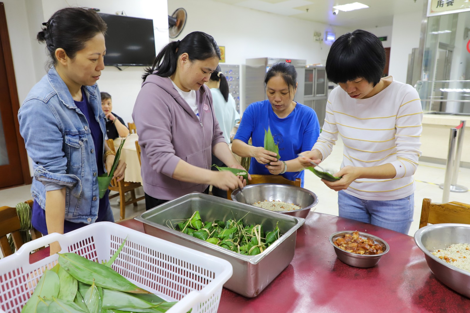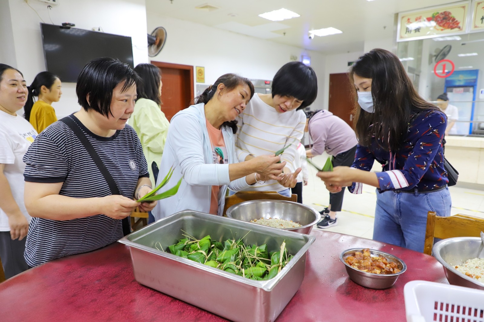 活動現(xiàn)場,食堂工作人員精心準(zhǔn)備了包粽所需的材料,在桌上整齊地?cái)[放著粽葉、糯米、蛋黃、五花肉等,包粽子小能手們早早地來到了活動現(xiàn)場,大家圍在一起巧手包粽子。首先卷粽葉,做成漏斗狀,再填糯米、加餡料,然后壓緊實(shí)、封口、扎捆......。大家齊心合力、分工協(xié)作、相互配合,一個個三角形、牛角形、錐形、長條形等各式各樣的粽子在職工手中誕生了。在包制過程中,大家相互交流經(jīng)驗(yàn)和技巧,歡聲笑語,其樂融融。